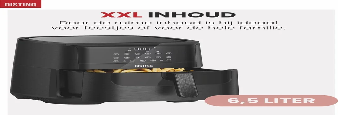 Zoek je al langer naar een kwalitatief goede XXL Airfryer voor een niet al te hoge prijs? Dan ben je hier aan het juiste adres! De DistinQ Airfryer XXL heeft maar liefst een inhoud van 6,5 liter. Ideaal voor het bereiden van gerechten voor het hele gezin. Zo bereid je met gemak vlees, vis, groente, snacks, frietjes en je favoriete cake! Door de 12 verschillende bereidingsfuncties maak je binnen een handomdraai al jou favoriete gerechten. Ook is de DistinQ Airfryer XXL compacter dan andere XXL Airfryers. Hierdoor neemt de Airfryer een stuk minder ruimte in beslag. Ideaal Toch?